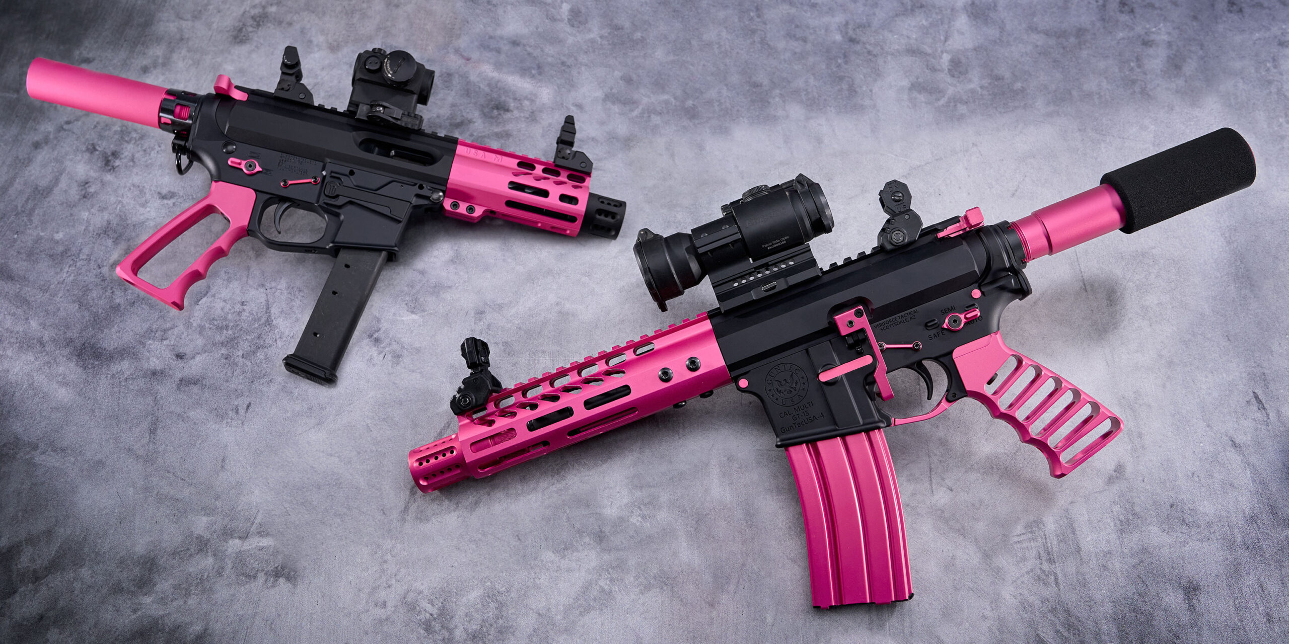 AR 9mm Micro Pistol and AR15 5.56 7″ Pistol Furniture Set in Anodized Pink