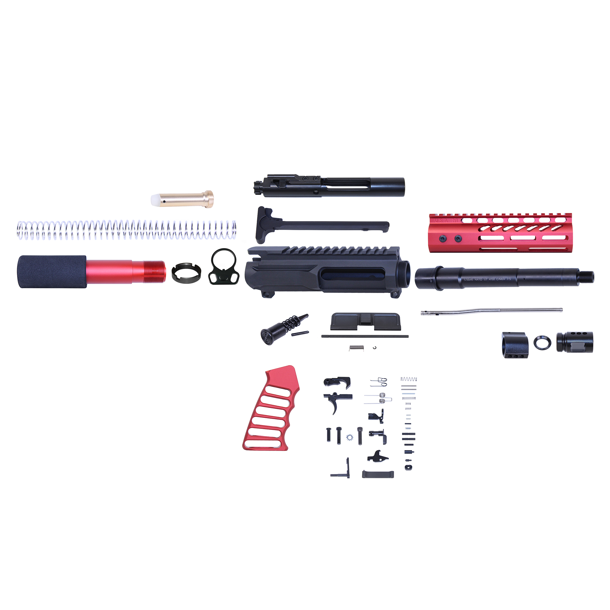 - Anodized Red Finish On Handguard, Grip, And Pistube